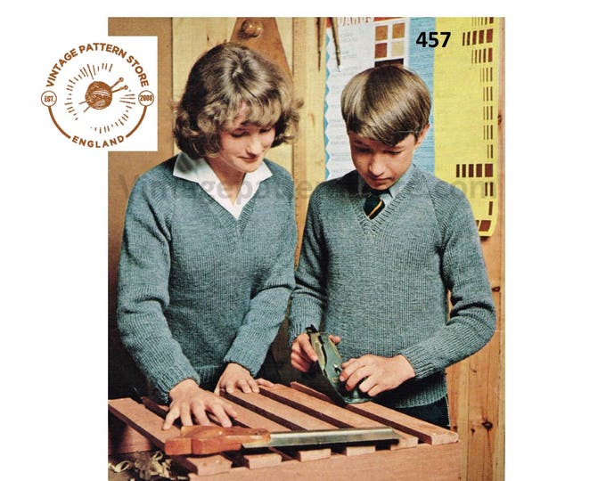 Girls Boys plain and simple easy to knit V neck back to school raglan DK sweater jumper pdf knitting pattern 30" to 36" chest Download 457