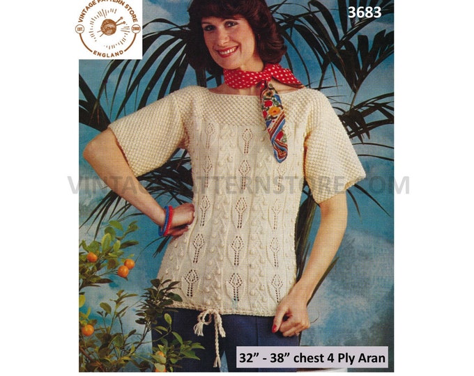 Ladies Womens 80s boat neck short sleeve cable cabled lacy & textured 4 ply sweater jumper pdf knitting pattern 32" to 38" Download 3683