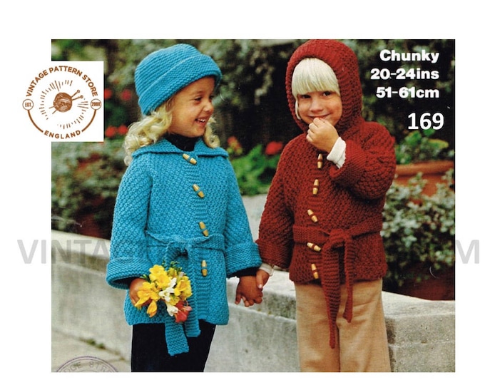 Girls Boys 70s vintage chunky knit toggle tie belted duffle coat with optional collar or hood pdf knitting pattern 20" to 24" Download 169
