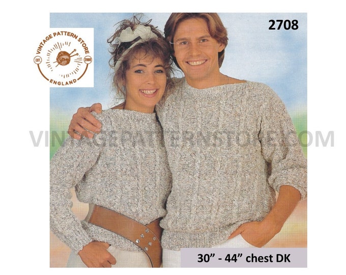 Ladies Womens Mens 80s vintage DK slash neck cable cabled drop shoulder dolman sweater jumper pdf knitting pattern 30" to 44" Download 2708