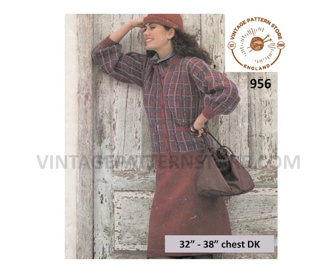 Ladies Womens 80s vintage DK round neck check dolman cardigan & easy to knit skirt pdf knitting pattern 32" to 38" chest PDF download 956