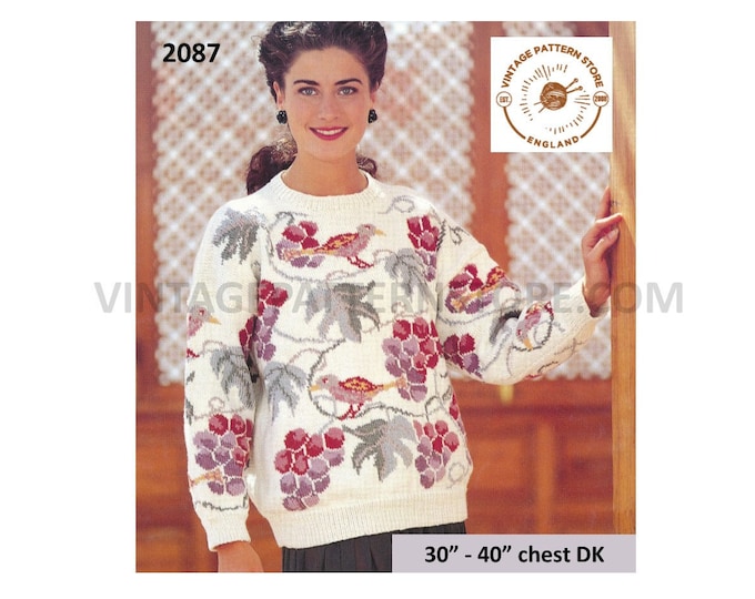 Ladies Womens 90s DK round neck drop shoulder floral rose intarsia raglan cardigan pdf knitting pattern 30" to 40" Instant PDF Download 4849